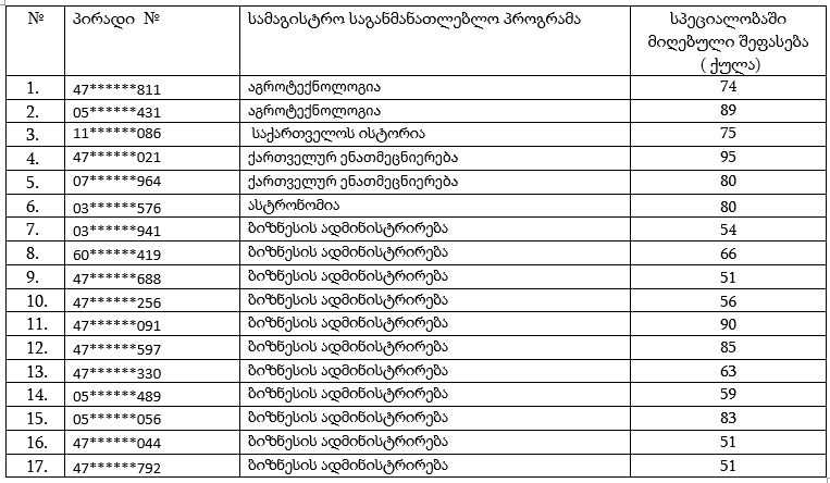 სამაგისტრო პროგრამებზე მისაღები გამოცდების შედეგები სპეციალობაში